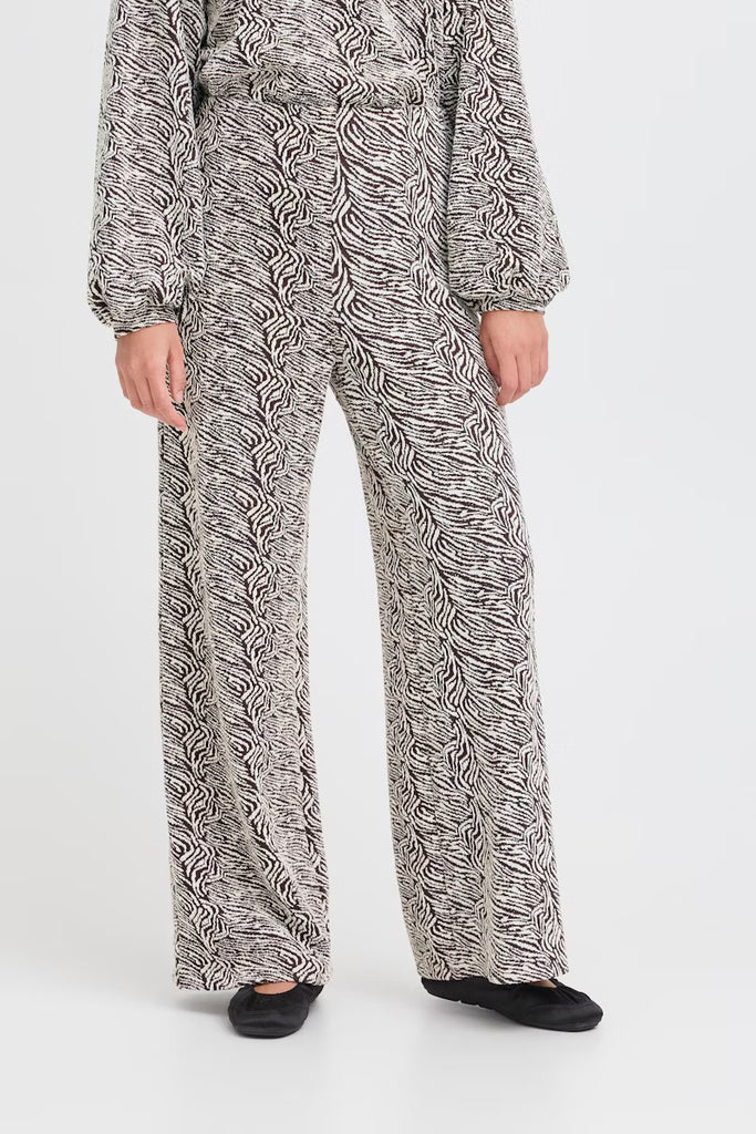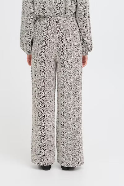 Deze broek met wijde pijpen heeft een comfortabele pasvorm, hoge taille en volledige lengte.