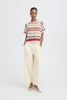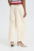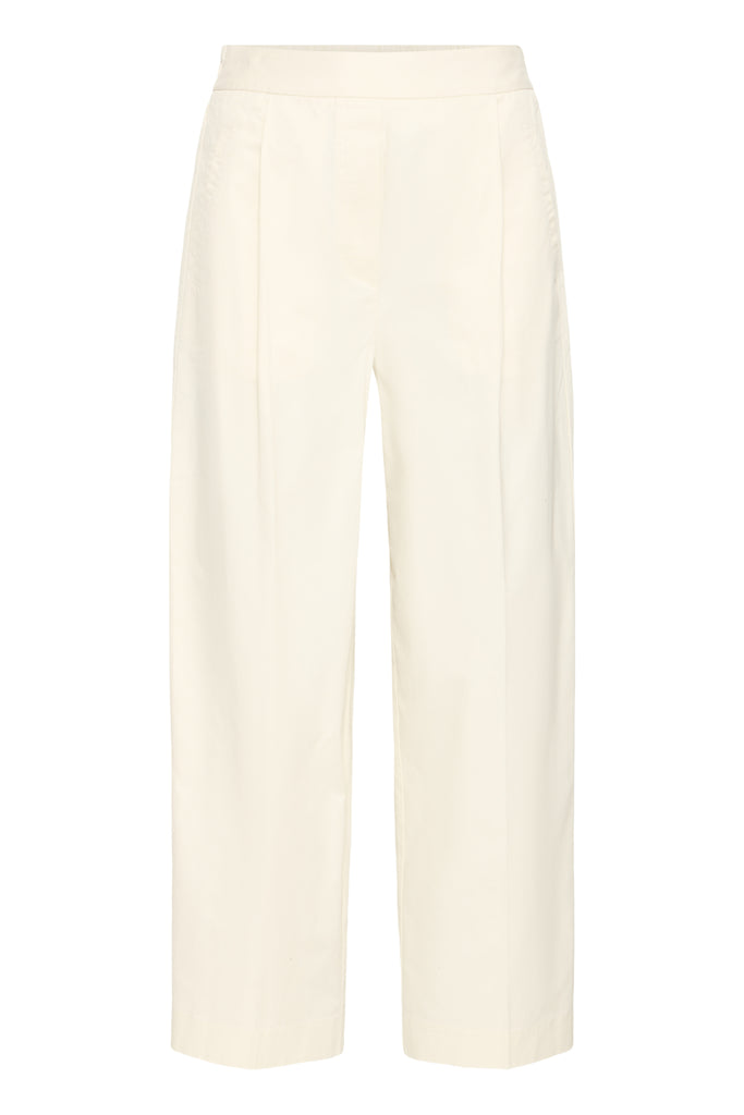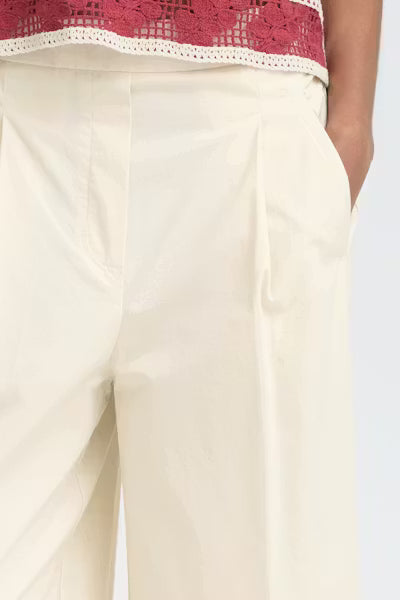 Wijdvallende broek met rechte, losse pasvorm en zachte uitstraling. Hoge taille, ingestikte plooien aan de voorkant, zijzakken en cropped lengte.