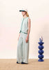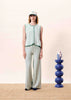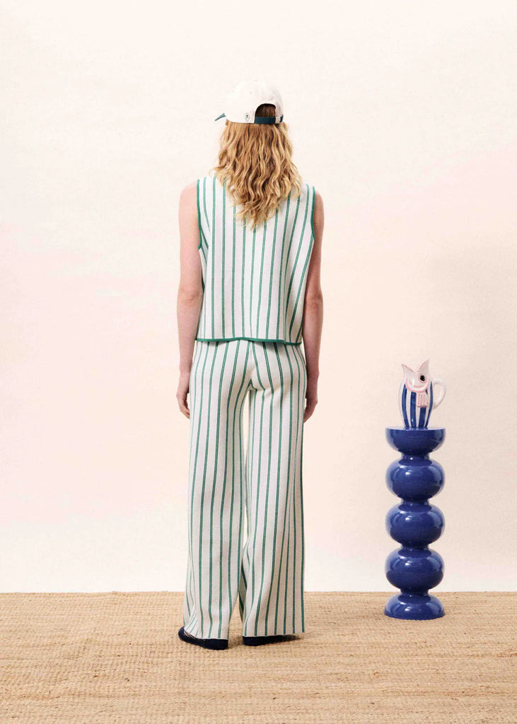 • Wijde, soepelvallende broek • Groene verticale strepen op een witte achtergrond • Hoge taille met elastische tailleband met plooien • Enkellengte • Rechte pijpen