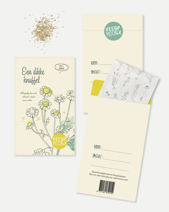 Een beetje liefs zaaien met het zadenzakje 'Een dikke knuffel'. Moederkruid staat voor warmte. Om iemand een knuffel toe te sturen. Op de achterzijde kan je de naam van de ontvanger schrijven en de reden waarom je het zadenzakje geeft. Een leuk cadeautje om te geven of te versturen.