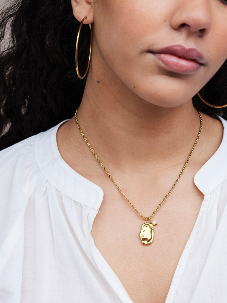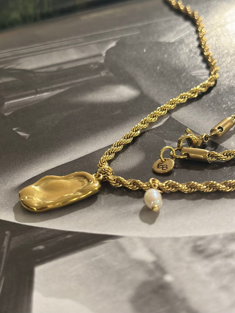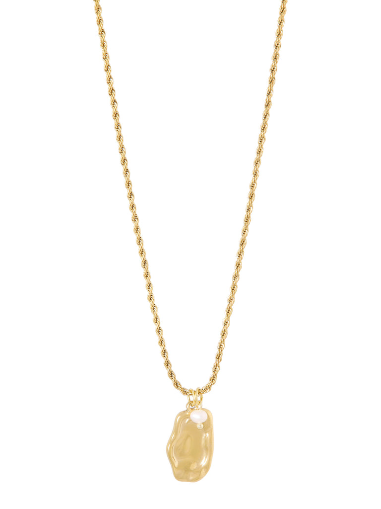"Rope" ketting met organische hanger en zoetwaterparel. De afmetingen van de hanger zijn 2.2 x 1.2cm. De lengte van de ketting is 18 inch (45cm).