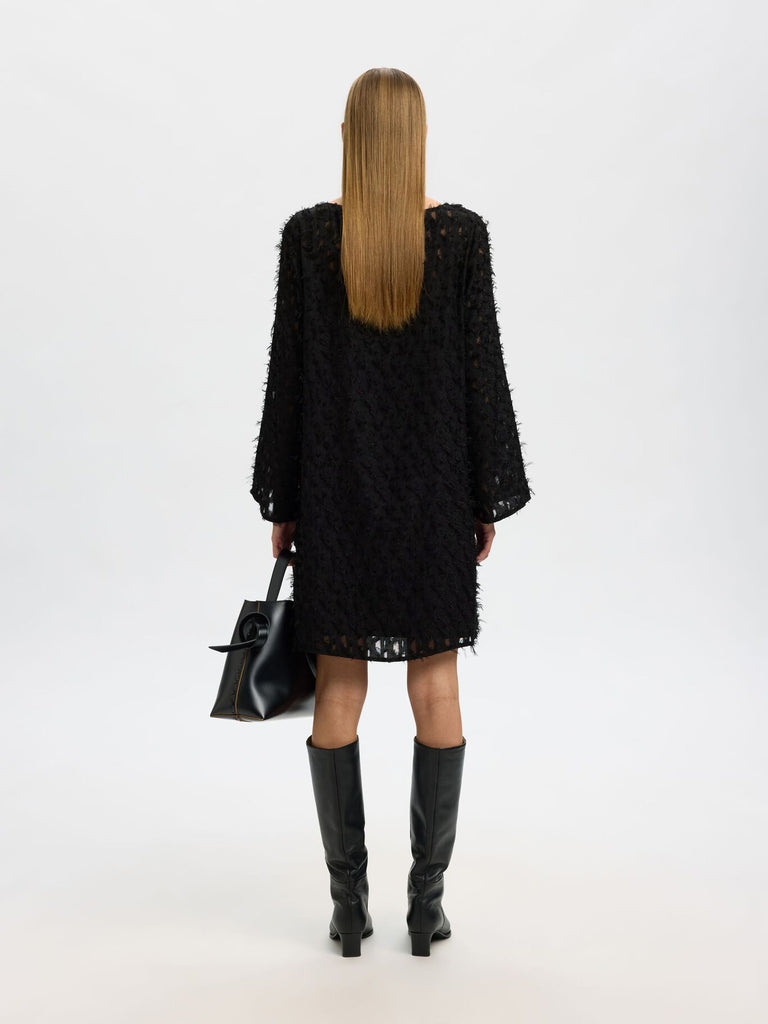 Maak een stijlvol statement in deze mini-jurk met veren. Met de riem accentueer je jouw taille.