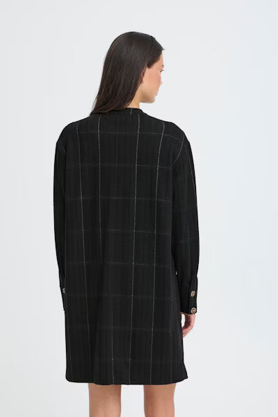 Rechte jurk met een subtiele ruitjesstructuur, staande kraag en knoopsluiting. Met lange mouwen en een knielang silhouet voor een scherpe, moderne look.