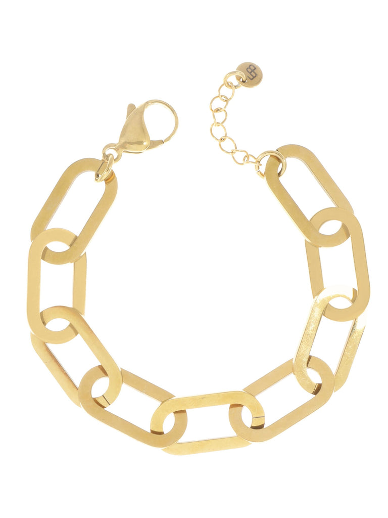 Grote schakelarmband met platte ovale schakels. De schakels zijn 2.5 x 1.3 cm. De armband heeft van een verlengkettinkje van 2.5 cm zodat hij altijd past.  Verguld op longlasting stainless steel.