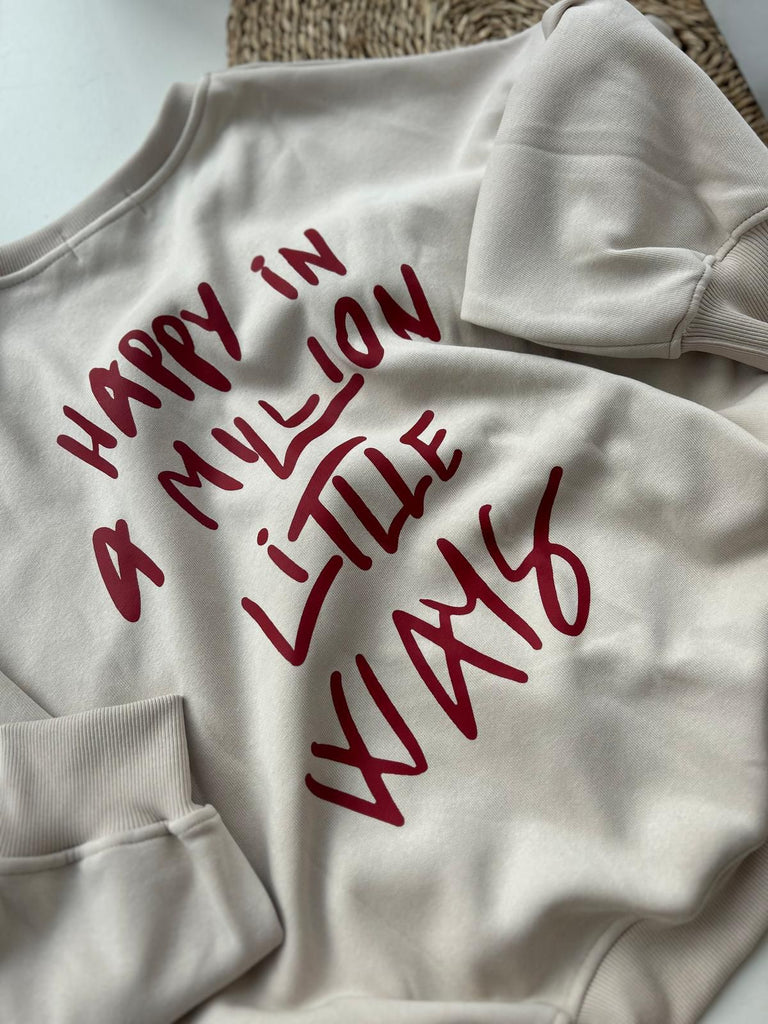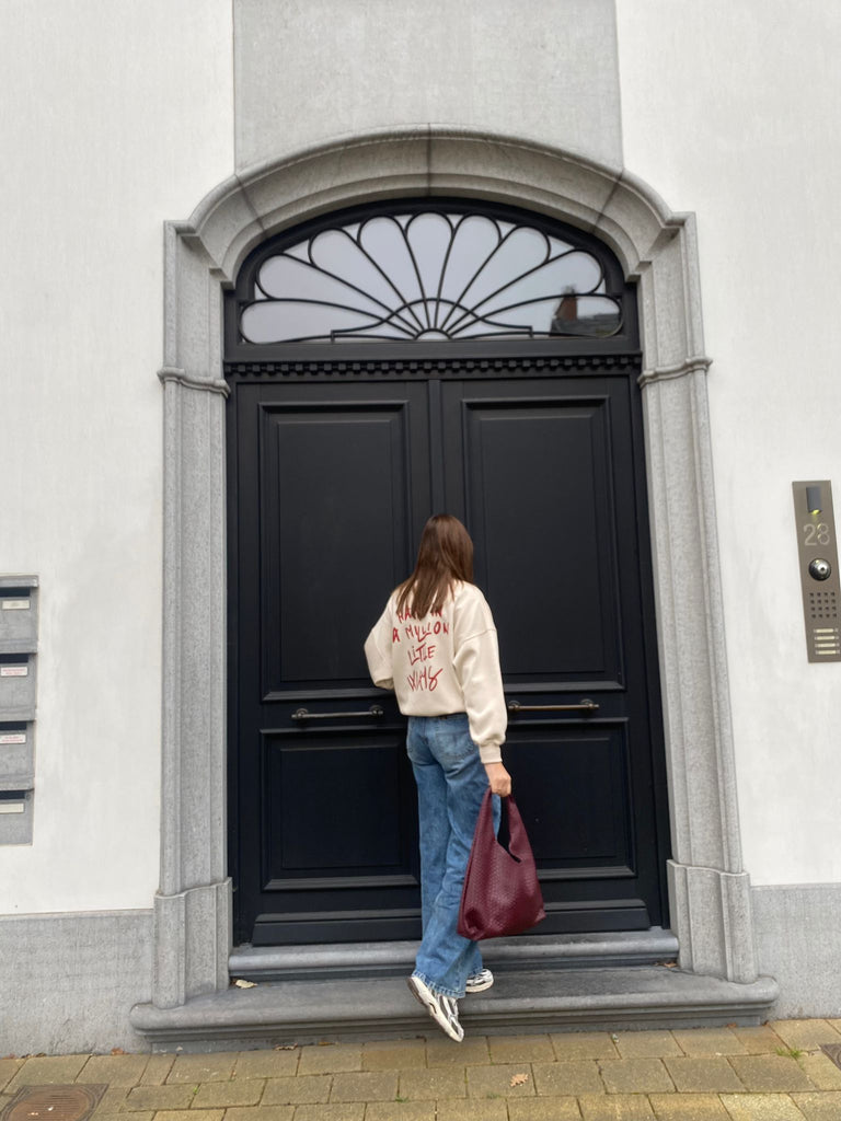Deze pull is one size en heeft een leuke tekst op de achterkant.