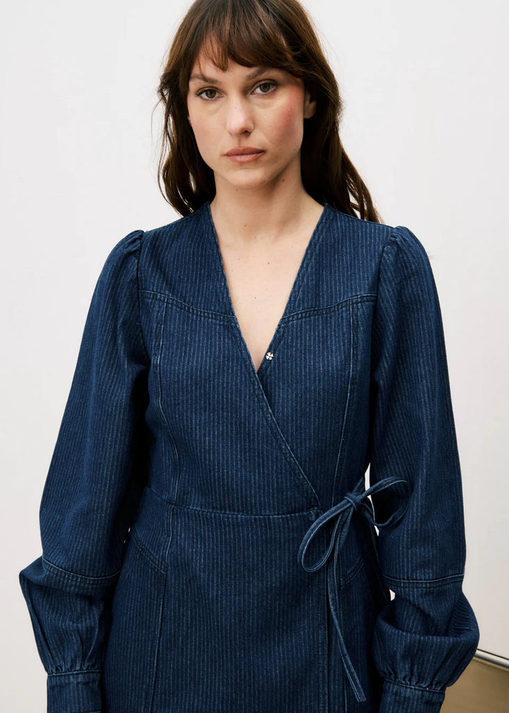 Soepelvallende blauw gestreepte denim korte wikkeljurk met crossover v-hals, lange mouwen met licht gestructureerde schouders Dunne strikceintuur aan de zijkant die de taille mooi tailleerd.