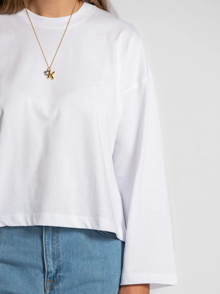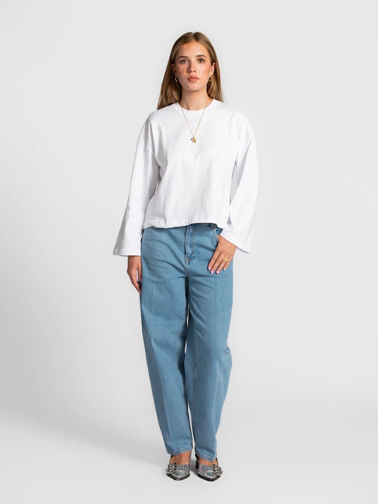 Aline is dé basic die je nodig hebt! Dit longsleeve T-Shirt heeft een trendy boxy fit en is gemaakt van ademend katoen, zodat het net zo goed voelt als het eruitziet. Ideaal om die casual, effortless look te bereiken.