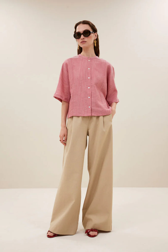 De siem chambray blouse is een casual blouse met een comfortabele, losvallende pasvorm. Dankzij de ronde halslijn en de knoopsluiting draag je deze top moeiteloos en stijlvol. De korte mouwen geven het ontwerp een relaxte, maar verzorgde uitstraling. Een tijdloos, uni item dat perfect is voor dagelijks gebruik en veelzijdig te combineren.