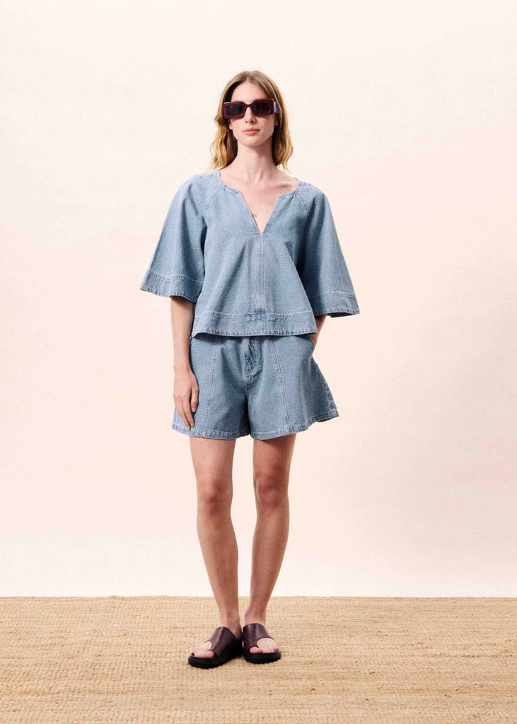 Relaxte, losvallende blouse met v-hals, een split in het midden met knoopsluiting en wijde driekwartmouwen in een lichtblauwe gewassen denimstof.